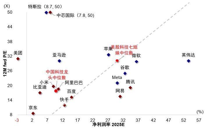 图表4:但结合盈利能力两边则相对合理,甚至部分中国科技龙头估值还有些高估
