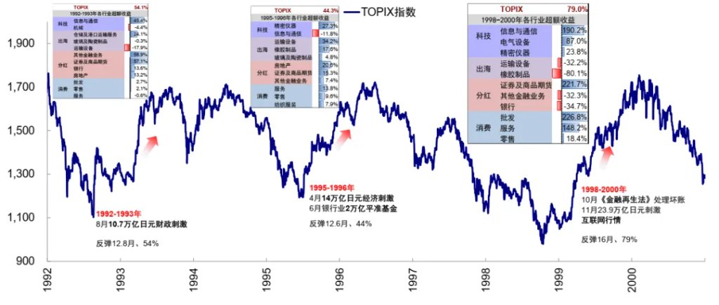纵观日股90年代的这三轮“牛市”,增长低迷和低利率时代下牛市的启动都离不开内部大规模财政刺激这一“必要条件”,若政策更为“对症”且叠加外部产业趋势,则可持续更久。具体而言,