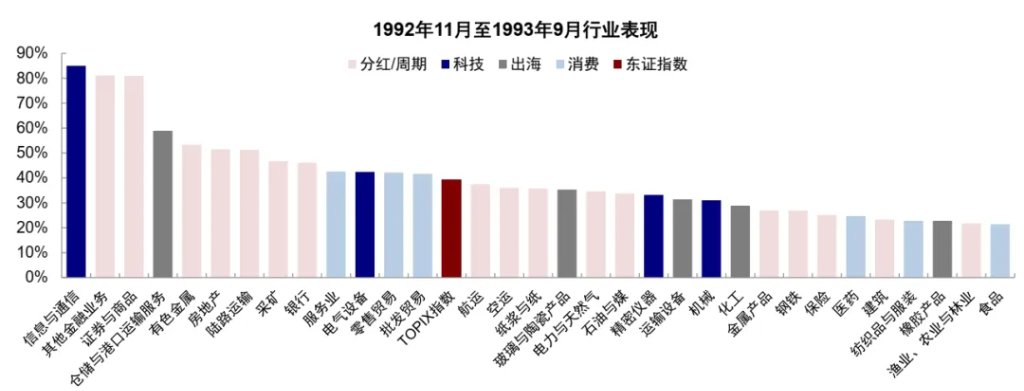 结束:基本面依然疲弱下政策不及预期。1993年9月日本政府再推出6.15万亿日元刺激、日央行再降息75bp,但财政规模不及之前,并未让股市延续上涨。叠加银行坏账问题逐渐浮出水面,日股从1993年9月转为下跌,随后3个月的时间里日经225和东证指数分别回调了23%和20%,期间前期牛市中上涨较多的信息通信与金融地产等行业领跌,而零售贸易、电力与天然气等行业跌幅较小。