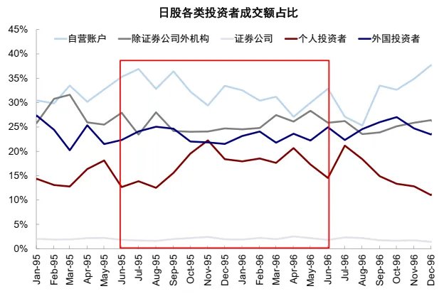 3) 从投资者结构看,个人投资者入市热情同样未能持续,外国投资者成交占比有所抬升。个人投资者在成交额中的占比从1995年8月的12.5%抬升至11月的高点22.3%,但随后一直下行至牛市结束时的14.9%。外国投资者的成交占比则从牛市启动前的24.6%抬升至牛市结束后1996年7月的高点27.0%。