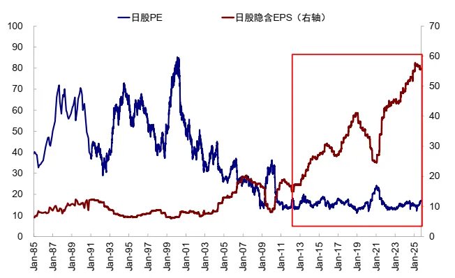 1) 估值扩张是主要贡献,盈利反而回落,期间日股静态PE扩张了106%,而隐含的EPS增速回落了25%。