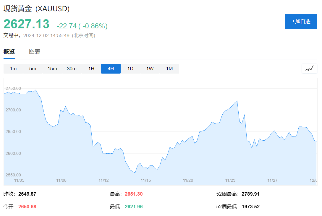现货黄金震荡下跌,一度跌超1%,几乎抹平此前4天累计涨幅,现跌0.86%报2627.13美元/盎司。多位分析师表示,短期金价面临调整需求,但对金价长期走势依旧持乐观态度。