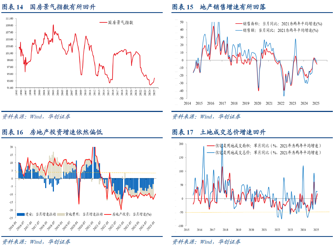 销售方面,1-2月商品房销售面积同比为-5.1%,12月为-0.5%。1-2月商品房销售额同比为-2.6%,12月为2.4%。投资方面,增速有所收窄。1-2月,地产投资增速为-9.8%,12月为-13.3%。1-2月,新开工面积同比为-29.6%,去年12月为-23.0%。竣工面积1-2月同比为-15.6%。施工面积,1-2月累计增速为-9.1%,好于去年全年的-12.7%。土地成交面积同比有所回升,1-2月,百城住宅类用地成交面积同比增速为5.7%,去年四季度为-4.7%。1-2月,受部分城市土拍火热影响,土地成交总价增速达到25.6%。