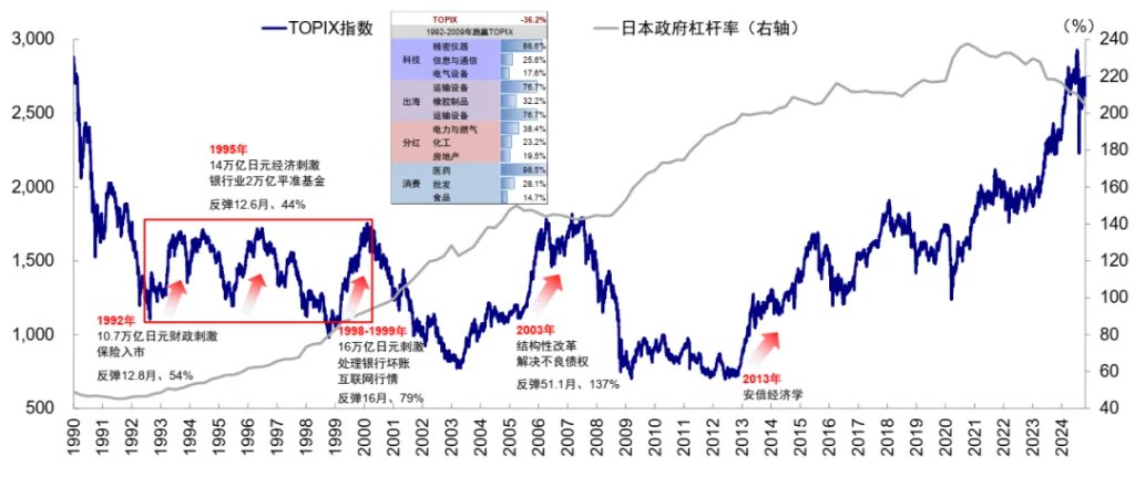 纵观日股90年代的这三轮“牛市”,增长低迷和低利率时代下牛市的启动都离不开内部大规模财政刺激这一“必要条件”,若政策更为“对症”且叠加外部产业趋势,则可持续更久。具体而言,