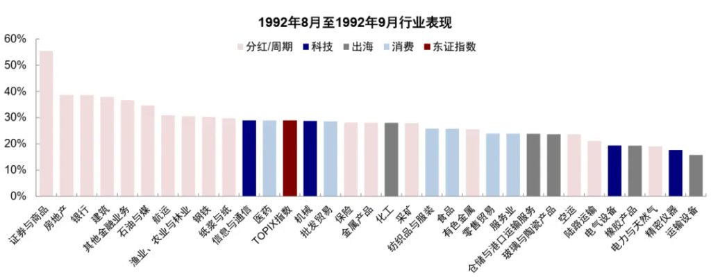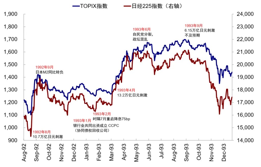 过程:东证指数从1992年8月低点到1993年9月高点反弹54%、持续12.8个月。具体分为三个阶段:1)快速冲高:在8月10.7万亿日元经济对策发布后不到一个月的时间里,日经225和东证指数分别反弹了32%和28%。2)回调震荡:随后9月日本M2同比转负,消费者信心指数加速回落,经济数据不及预期下股市回调至1992年11月。3)再度反弹:整体指数历经4个月左右震荡,直至1993年2月日央行时隔7个月重启降息75bp、4月宫泽内阁推出13.2万亿日元刺激后,财政货币再加码推动日股再反弹至1993年9月。
