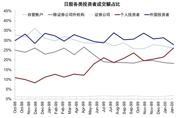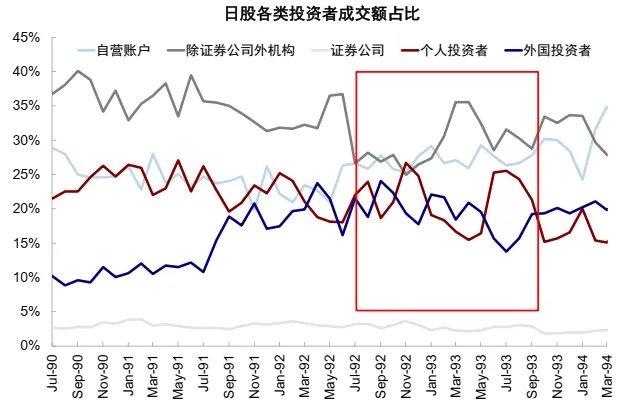 3) 从投资者结构看,个人投资者占比一度抬升,海外投资者占比下行,机构投资者抬升。本轮牛市初期日本个人投资者情绪较亢奋,个人投资者占成交额比例从1992年9月的18.7%快速抬升至11月的26.7%,但市场震荡期回落至1993年4月的低点15.5%,随后再度反弹至1993年7月牛市结束前的25.5%。相比之下,海外投资者成交占比初期从1992年8月的18.8%抬升至9月的24.1%,但随后一直下行至牛市结束前1993年7月的13.8%,除券商外机构成交占比则从25.0%抬升至33.7%。