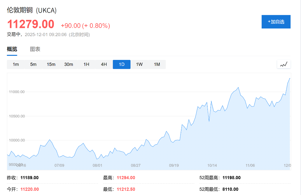 12月1日周一,伦铜创纪录新高。自8月底以来,LME铜价已上涨约13%,其背后的驱动因素同样指向供应紧张,以及贸易商为锁定溢价而将库存运往美国的套利行为。