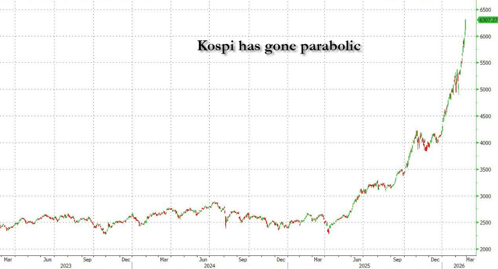 Kospi周四首次收于6300点上方,在过去11个交易日中有10天录得上涨,连续刷新历史高位。德意志银行策略师Jim Reid将其称为"2026年最非凡的股票市场",并指出这一涨幅"通常需要数年乃至数十年,而非数周"。高盛此前将Kospi年末目标价上调至5700点,但该指数已在一周内超越这一目标。