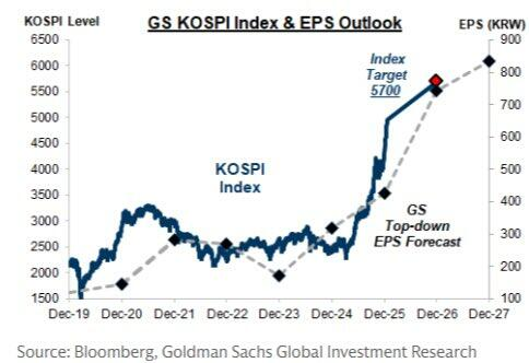 三星电子和SK海力士是这轮行情的绝对主角。两家公司合计占Kospi市值约40%,其年内涨幅分别高达82.5%和69.8%。高盛对韩国2026年每股盈利增长的预测高达75%,并注明"主要集中在两家公司",随后将Kospi年末目标价上调至5700点——而该指数已将这一目标远远甩在身后。